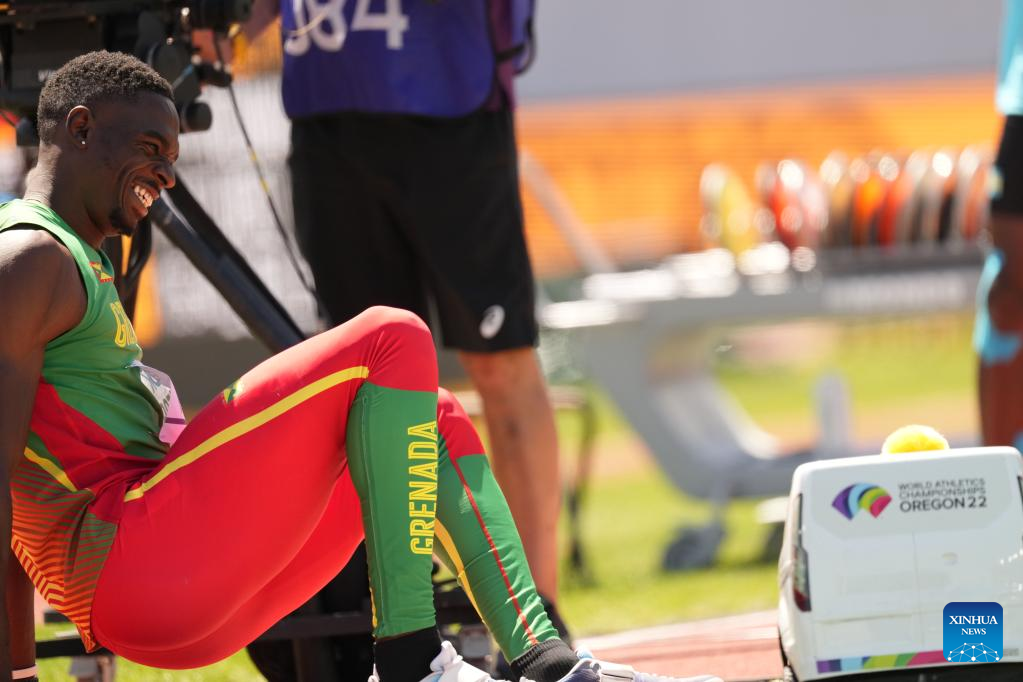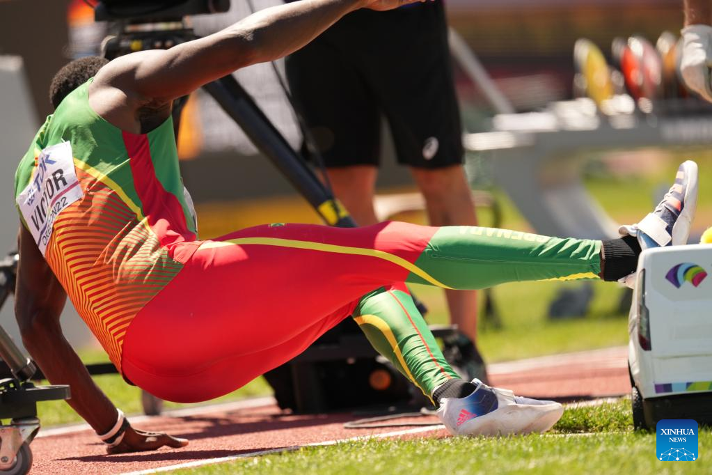 Lindon Victor of Grenada reacts after tackled by a remote controlled car during the discus throw of the Decathlon event at the World Athletics Championships Oregon22 in Eugene, Oregon, the United States, July 24, 2022. (Xinhua/Wu Xiaoling)
