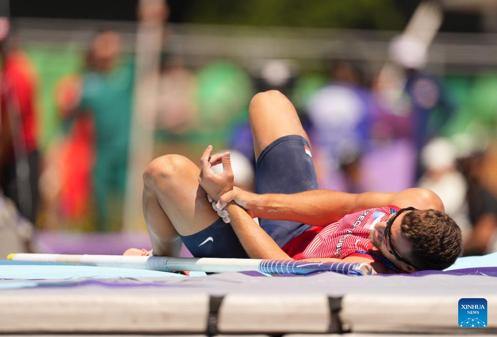 Jiri Sykora of the Czech Republic gets injured due to his broken pole during the pole vault of the Decathlon event at the World Athletics Championships Oregon22 in Eugene, Oregon, the United States, July 24, 2022. (Xinhua/Wu Xiaoling)