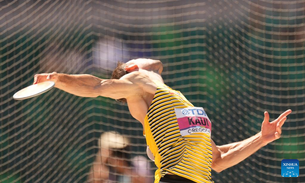 Janek Oiglane of Estonia competes during the discus throw of the Decathlon event at the World Athletics Championships Oregon22 in Eugene, Oregon, the United States, July 24, 2022. (Xinhua/Wu Xiaoling)