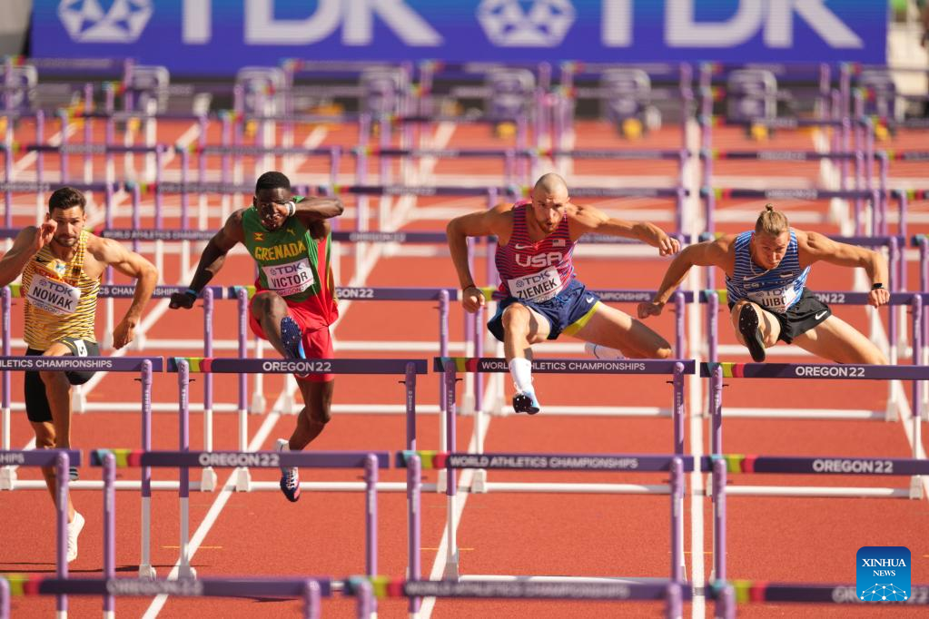 Tim Nowak of Germany, Lindon Victor of Grenada, Zachery Ziemek of the United States and Maicel Uibo of Estonia (L to R) compete during the 110m hurdles of the Decathlon event at the World Athletics Championships Oregon22 in Eugene, Oregon, the United States, July 24, 2022. (Xinhua/Wu Xiaoling)