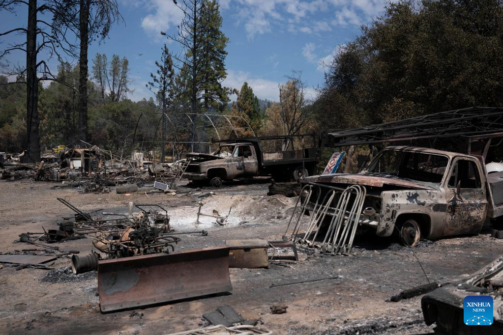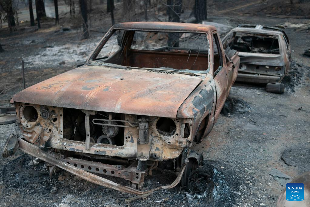 Photo taken on July 25, 2022 shows vehicles burned in a wildfire in Mariposa County in central California, the United States. Driven by hot, dry weather and drought conditions, the blaze began on Friday afternoon in Mariposa County in central California. It rapidly grows to be one of the largest wildfires in the state so far this year. (Photo by Li Jianguo/Xinhua)