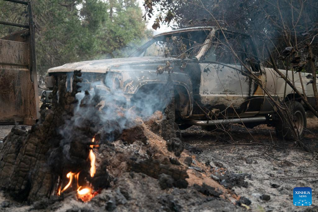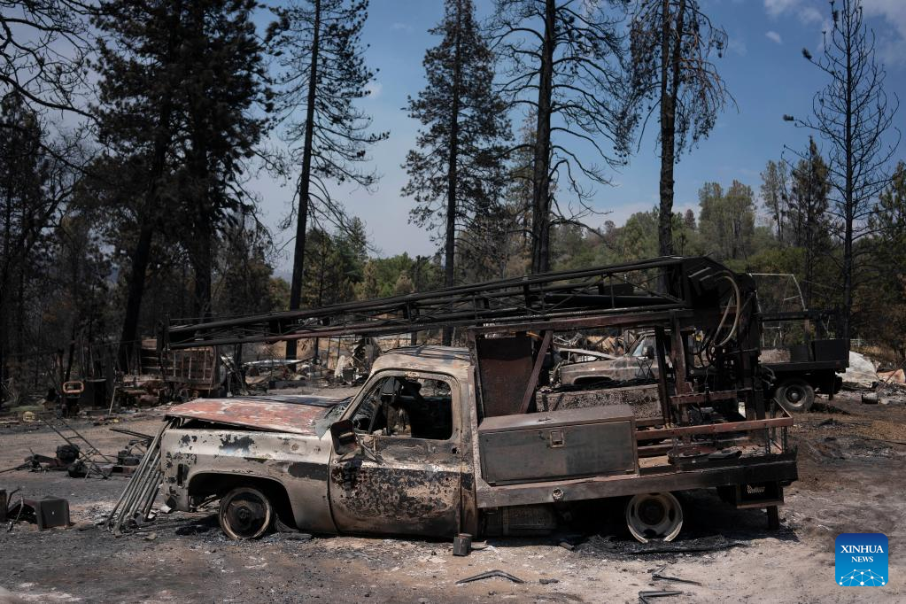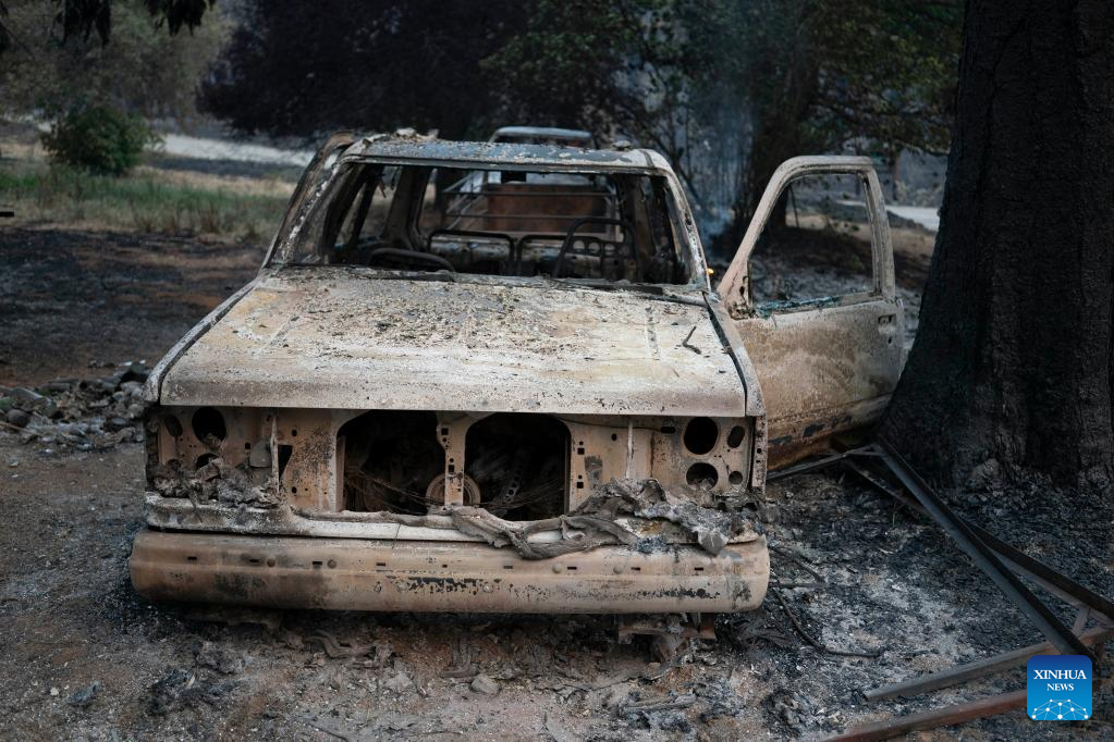 Photo taken on July 25, 2022 shows a vehicle burned in a wildfire in Mariposa County in central California, the United States. Driven by hot, dry weather and drought conditions, the blaze began on Friday afternoon in Mariposa County in central California. It rapidly grows to be one of the largest wildfires in the state so far this year. (Photo by Li Jianguo/Xinhua)