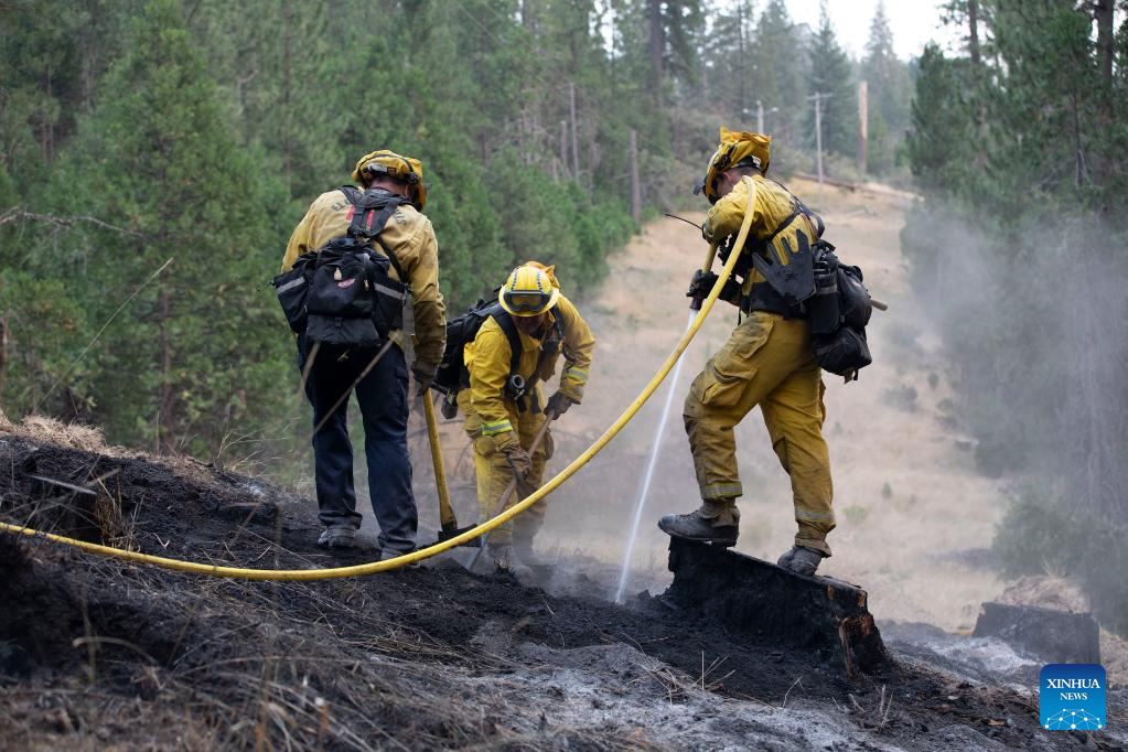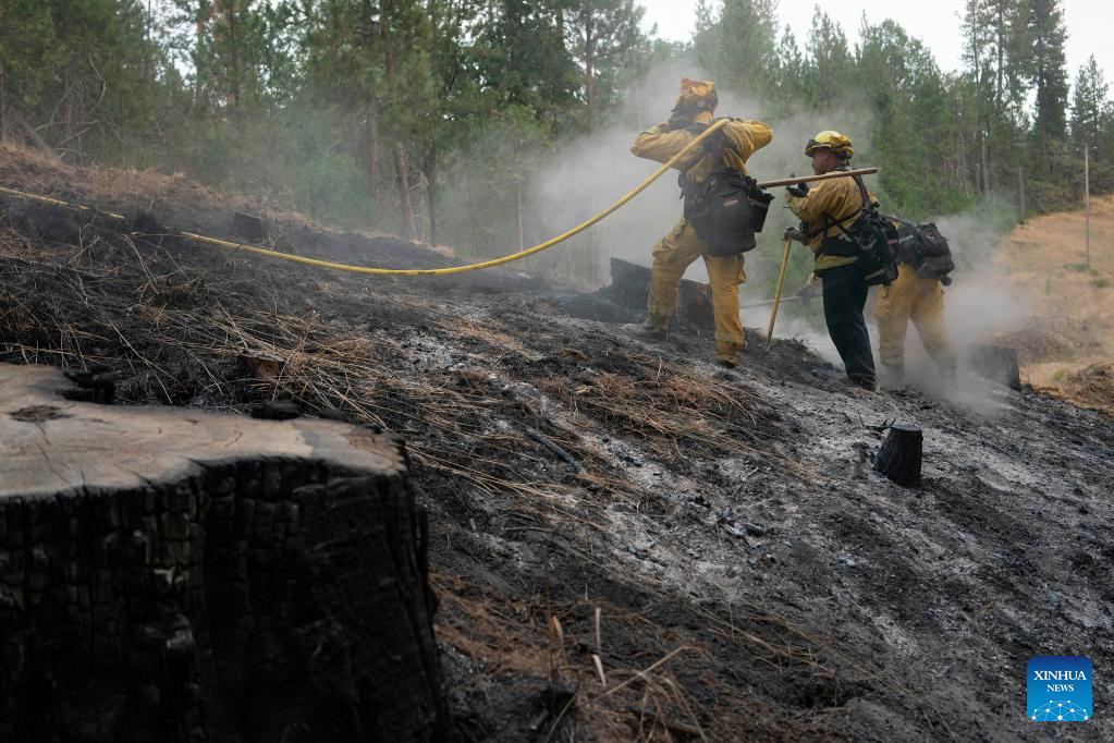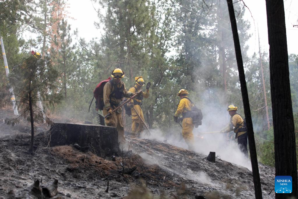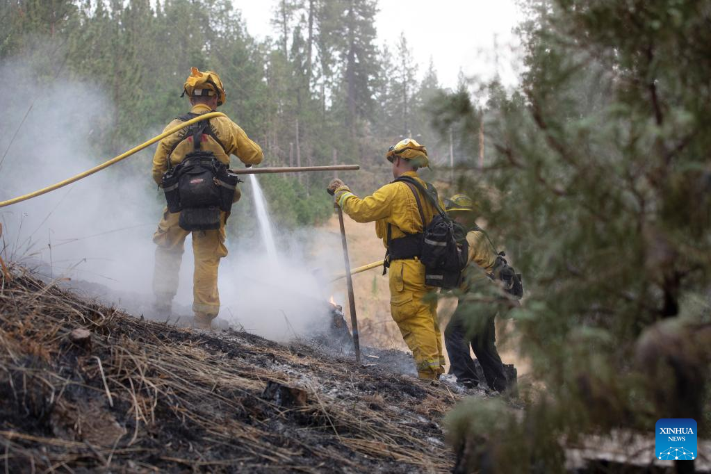 Firefighters work to contain the wildfire in Mariposa County in central California, the United States, July 25, 2022. Driven by hot, dry weather and drought conditions, the blaze began on Friday afternoon in Mariposa County in central California. It rapidly grows to be one of the largest wildfires in the state so far this year. (Photo by Li Jianguo/Xinhua)