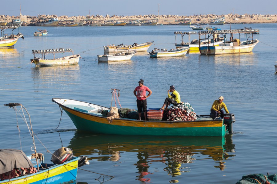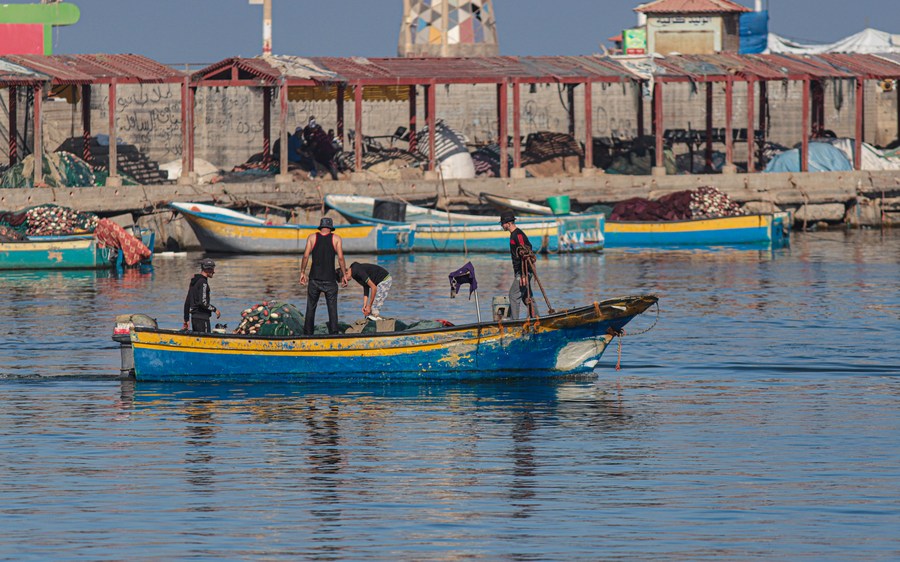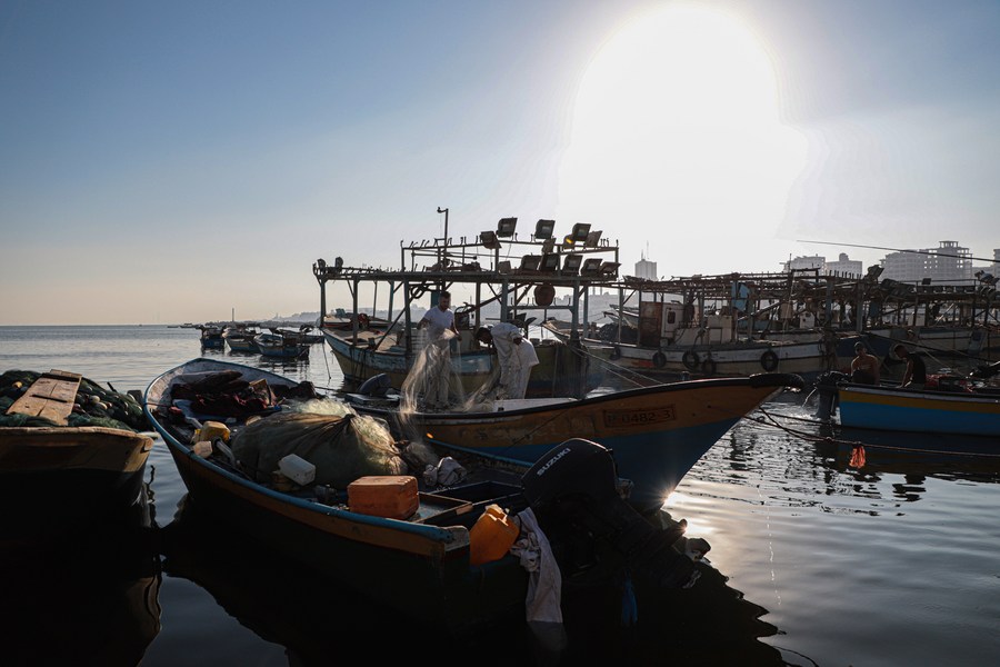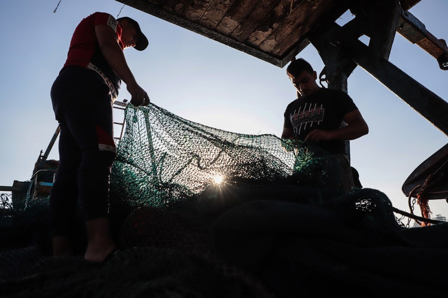 Palestinian fishermen work on a fishing boat on July 26, 2022. (Photo by Rizek Abdeljawad/Xinhua)