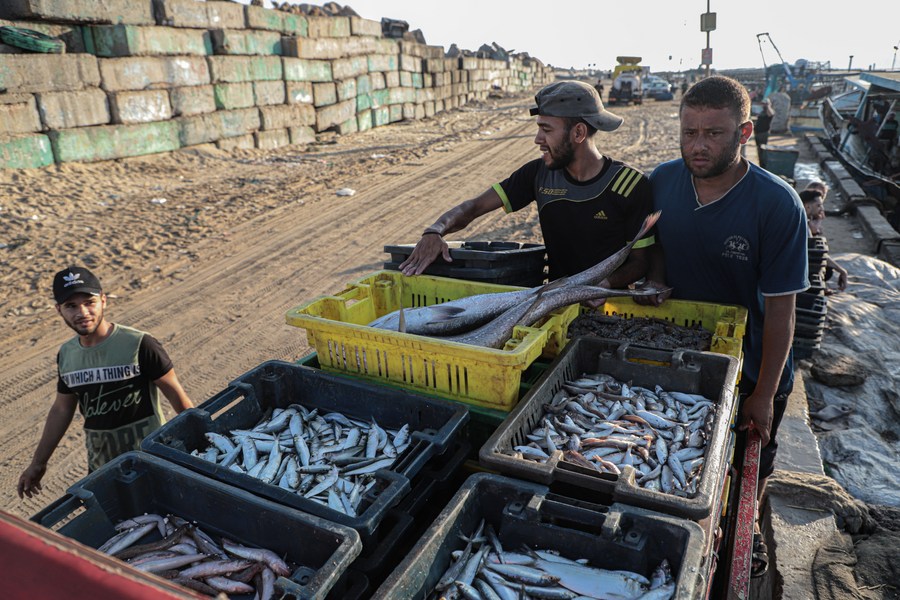 Palestinian fishermen caught fish from the Gaza sea and going to sell them on July 26, 2022. (Photo by Rizek Abdeljawad/Xinhua)
