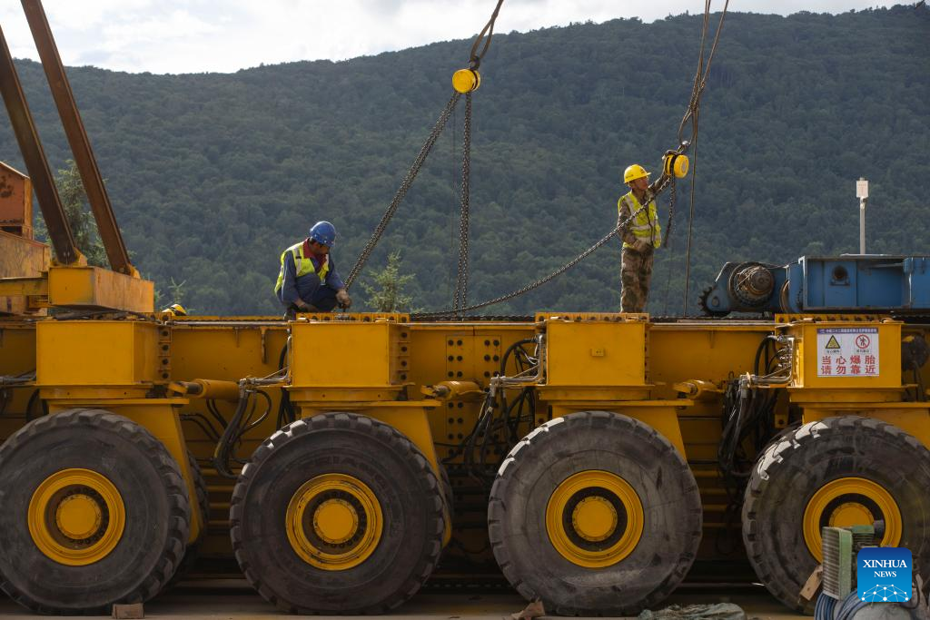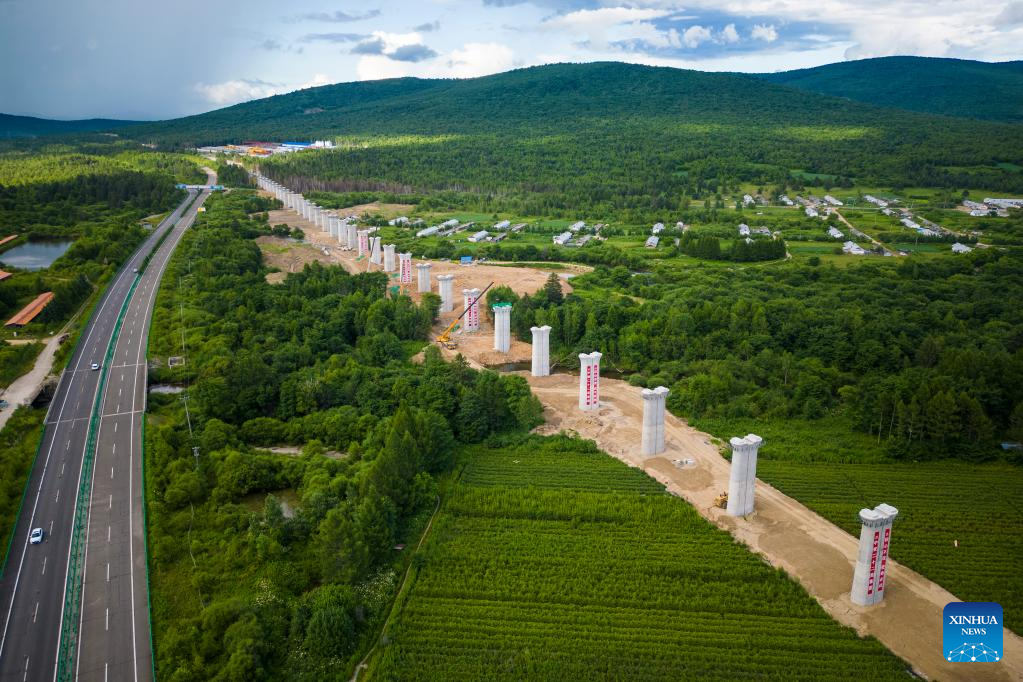 Aerial photo taken on July 25, 2022 shows the construction site of a super major bridge along the Harbin-Yichun high-speed railway, northeast China's Heilongjiang Province. Crossing permafrost regions, the Harbin-Yichun high-speed railway will total approximately 300 kilometers, connecting the cities of Harbin, Suihua, and Yichun. (Xinhua/Zhang Tao)
