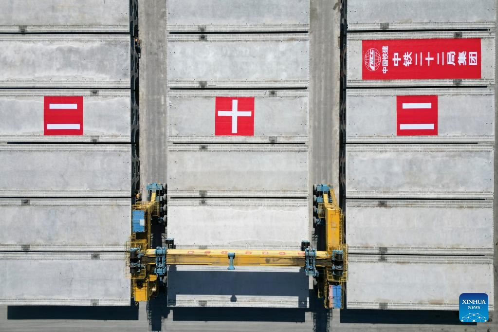 Aerial photo taken on July 25, 2022 shows workers at a beam fabrication yard in Yichun, northeast China's Heilongjiang Province. Crossing permafrost regions, the Harbin-Yichun high-speed railway will total approximately 300 kilometers, connecting the cities of Harbin, Suihua, and Yichun. (Xinhua/Zhang Tao)
