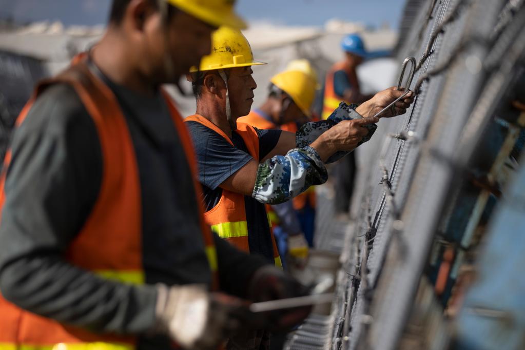 Workers operate at a beam fabrication yard in Yichun, northeast China's Heilongjiang Province, on July 25, 2022. Crossing permafrost regions, the Harbin-Yichun high-speed railway will total approximately 300 kilometers, connecting the cities of Harbin, Suihua, and Yichun. (Xinhua/Zhang Tao)