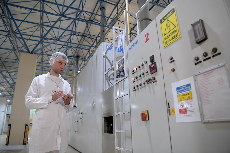 Harun Celebi, shift supervisor at the IHE Cebeci plant in the Sultangazi district, inspects the production process in Istanbul, Türkiye, July 19, 2022. (Xinhua/Shadati)