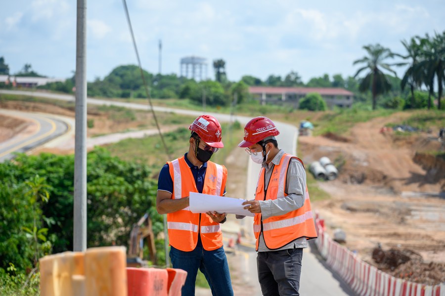 Muhammad Syahmin Bin Zainol (L), a field engineer for utility relocation, works at a construction site of the East Coast Rail Link (ECRL) project in Pahang, Malaysia, on July 25, 2022. (Xinhua/Zhu Wei)
