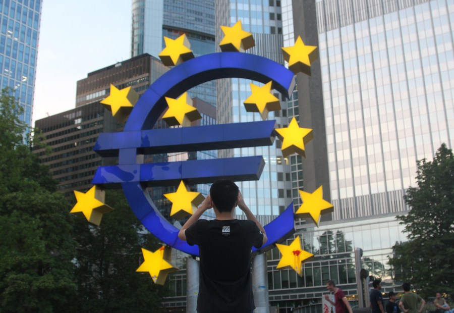 A man takes pictures of the Euro sculpture in Frankfurt, Germany, on July 12, 2022. (Xinhua/Shan Weiyi)