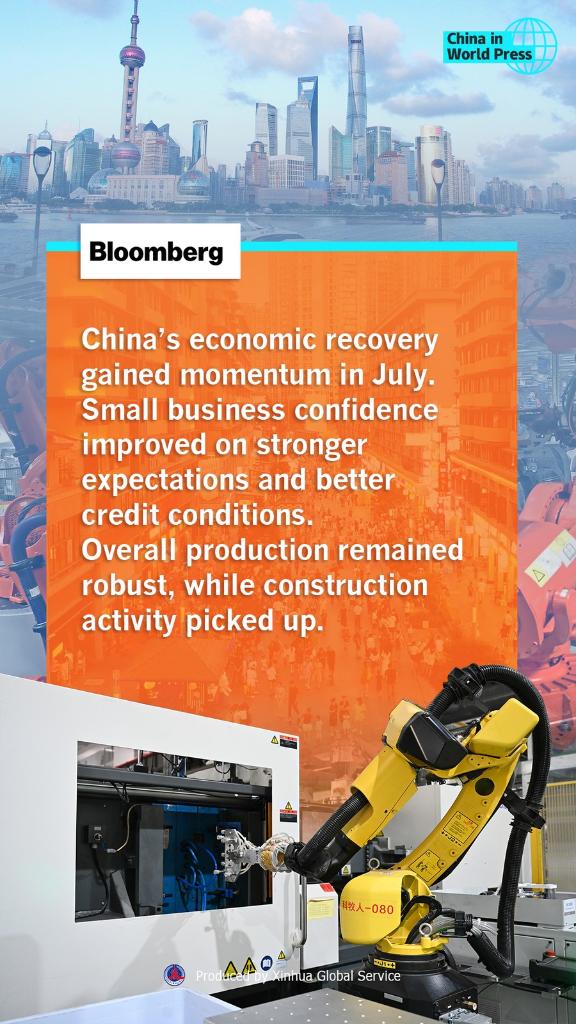 "China's economic recovery gained momentum in July as business activities resumed and confidence improved ... a level indicating the economy is heating up," a Bloomberg opinion piece commented.