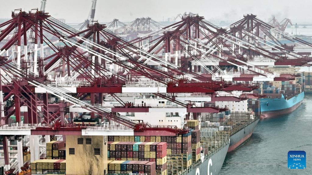 Aerial photo taken on July 29, 2022 shows a Maersk container vessel departing from the Qianwan Container Terminal in Qingdao Port, east China's Shandong Province. (Xinhua/Li Ziheng)