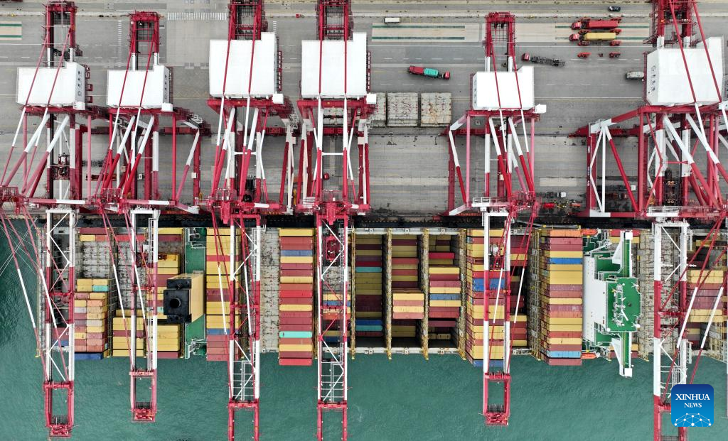 Aerial photo taken on July 29, 2022 shows a container vessel at the Qianwan Container Terminal in Qingdao Port, east China's Shandong Province. (Xinhua/Li Ziheng)