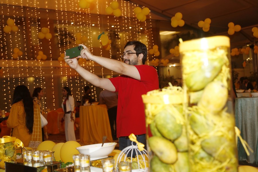 A man takes a selfie during a mango festival in Islamabad, capital of Pakistan, on July 29, 2022. (Xinhua/Ahmad Kamal)
