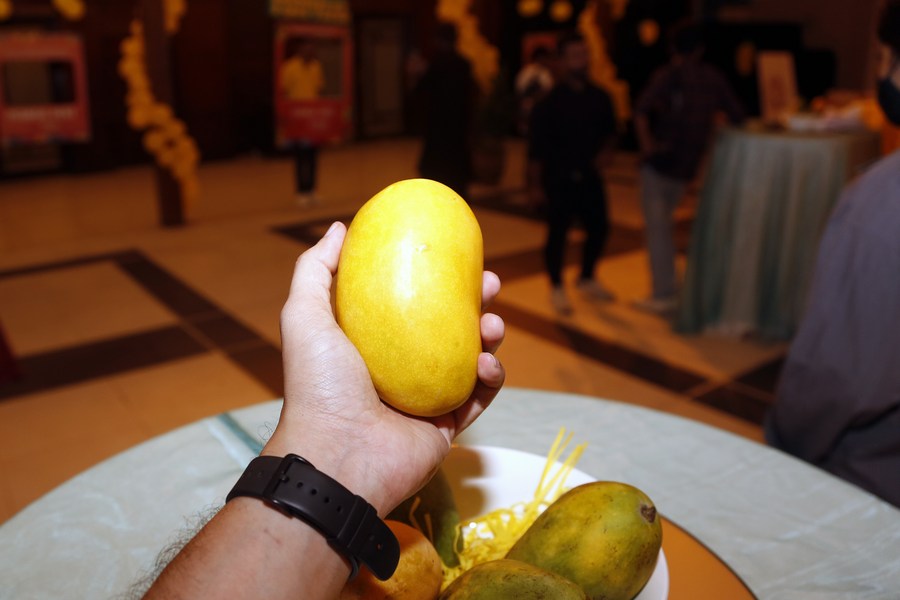 A man shows a mango during a mango festival in Islamabad, capital of Pakistan, on July 29, 2022. (Xinhua/Ahmad Kamal)■