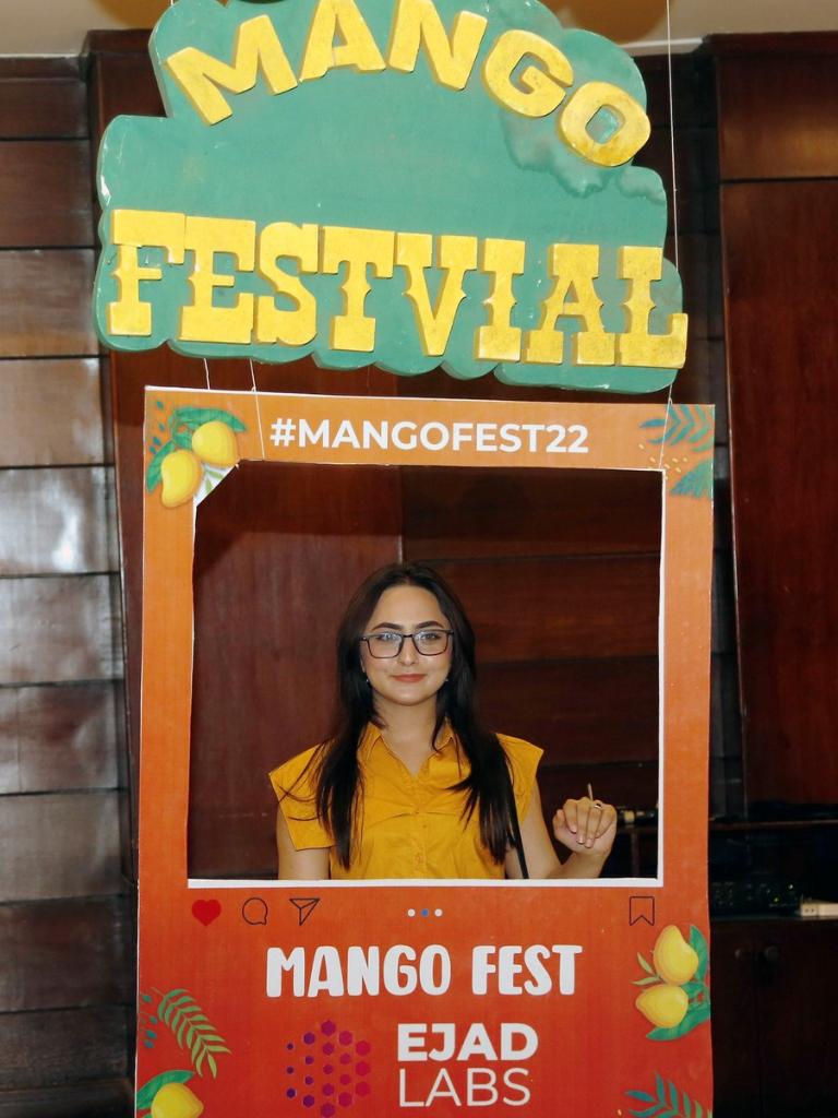 A woman poses for a photo during a mango festival in Islamabad, capital of Pakistan on July 29, 2022. (Xinhua/Ahmad Kamal)