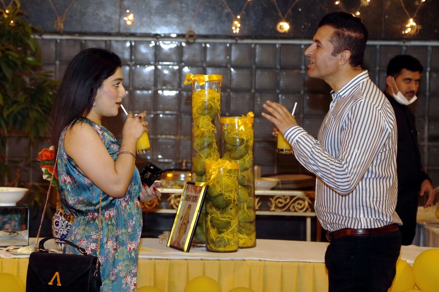 People enjoy mango drinks during a mango festival in Islamabad, Pakistan, on July 29, 2022. (Xinhua/Ahmad Kamal)