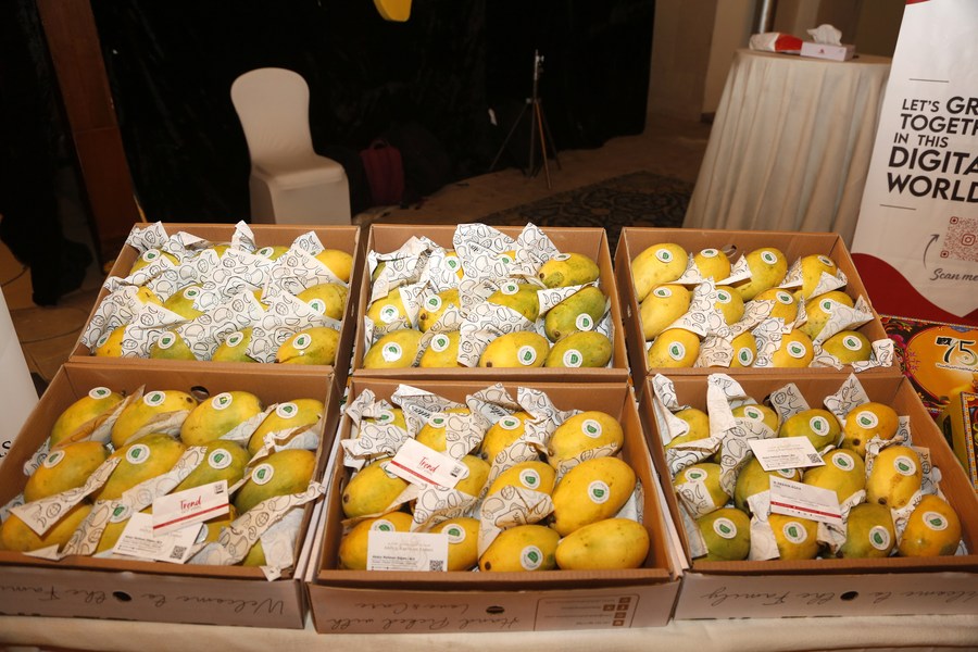 Mango gift boxes are seen during a mango festival in Islamabad, capital of Pakistan, on July 29, 2022. (Xinhua/Ahmad Kamal)