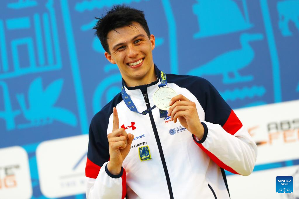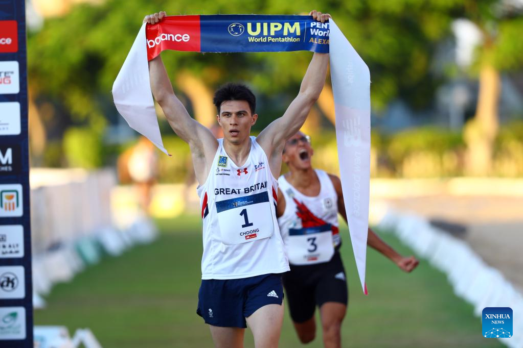 Joseph Choong of Britain celebrates after winning the men's final of the UIPM 2022 Pentathlon World Championships in Alexandria, Egypt, July 30, 2022. (Xinhua/Ahmed Gomaa)