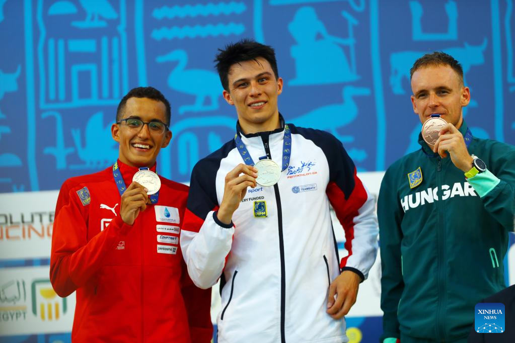 Gold medalist Joseph Choong (C) of Britain, silver medalist Elgendy Mohamed (L) of Egypt and bronze Medalist Balazs Szep of Hungary pose after the men's final of the UIPM 2022 Pentathlon World Championships in Alexandria, Egypt, July 30, 2022. (Xinhua/Ahmed Gomaa)