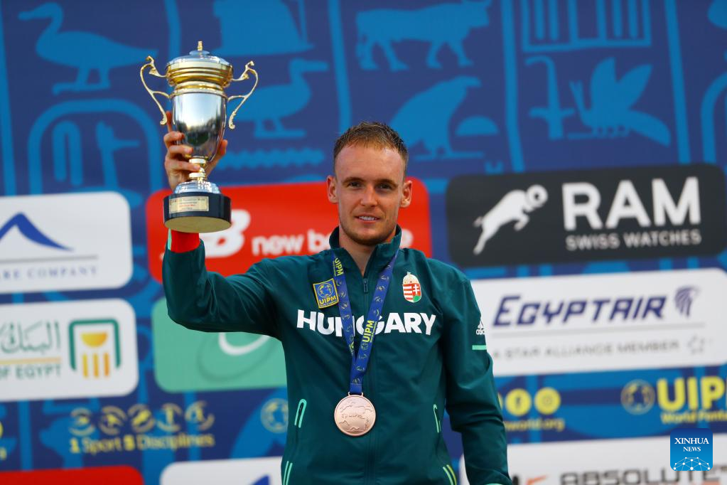 Balazs Szep of Hungary celebrates after winning the bronze medal at the men's final of the UIPM 2022 Pentathlon World Championships in Alexandria, Egypt, July 30, 2022. (Xinhua/Ahmed Gomaa)