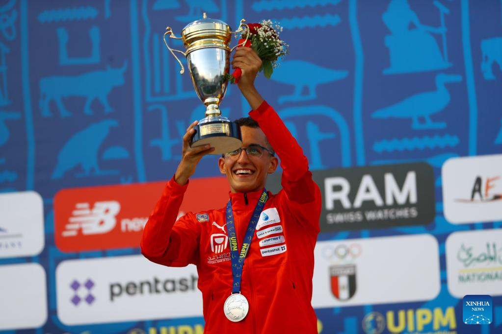 Elgendy Mohamed of Egypt celebrates after winning the silver medal at the men's final of the UIPM 2022 Pentathlon World Championships in Alexandria, Egypt, July 30, 2022. (Xinhua/Ahmed Gomaa)