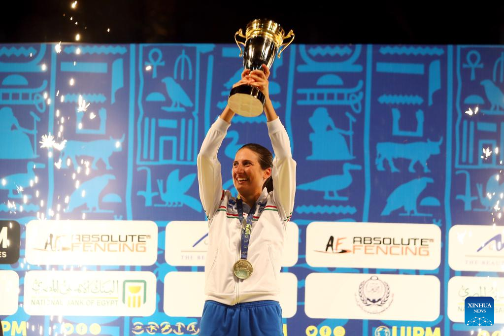 Elena Micheli of Italy celebrates with the trophy after winning the women's final of the UIPM 2022 Pentathlon World Championships in Alexandria, Egypt, July 30, 2022. (Xinhua/Ahmed Gomaa)