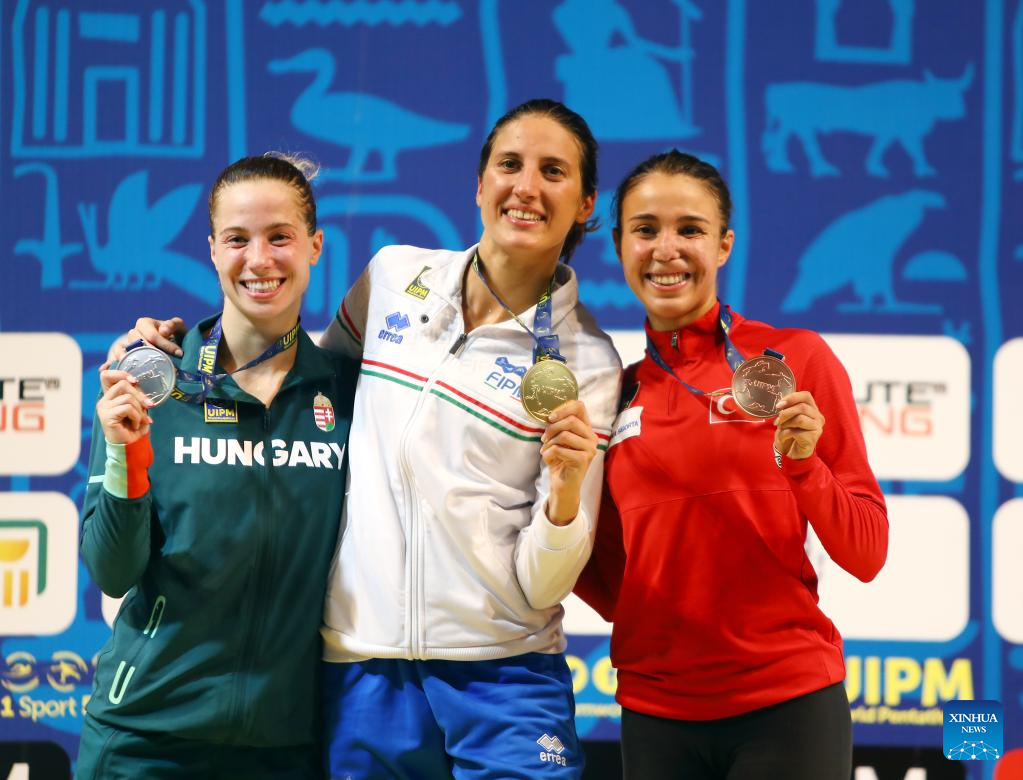 Gold medalist Elena Micheli (C) of Italy, silver Medalist Michelle Gulyas (L) of Hungary and bronze Medalist Ilke Ozyuksel of Türkiye pose after the women's final of the UIPM 2022 Pentathlon World Championships in Alexandria, Egypt, July 30, 2022. (Xinhua/Ahmed Gomaa)