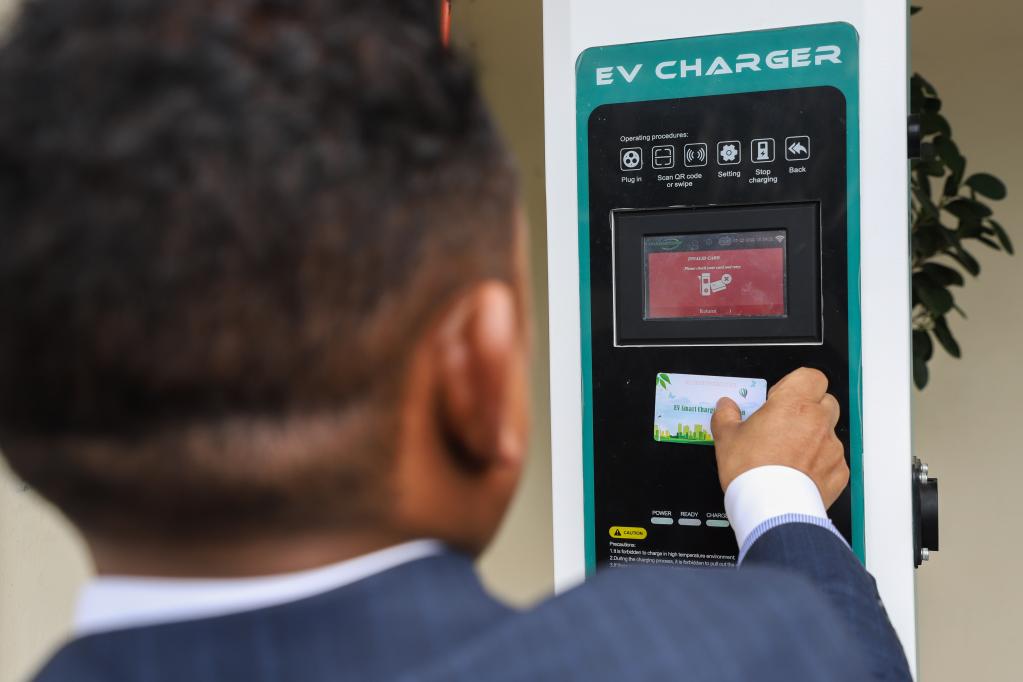 Kidem Tesfaye, chief executive officer of Green Tech Africa, shows how to operate a charging station at a company showroom in Addis Ababa, Ethiopia, on July 22, 2022. (Photo by Michael Tewelde/Xinhua)