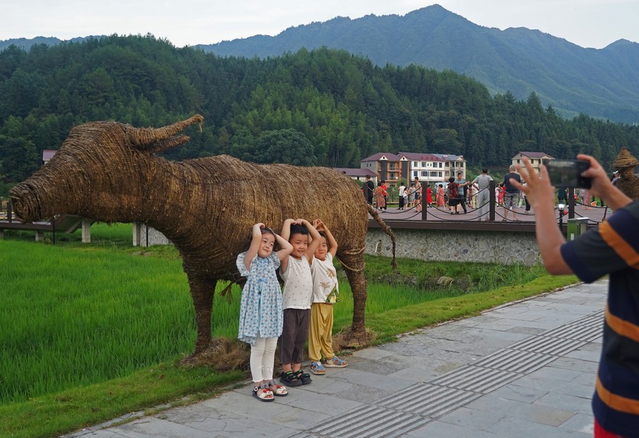 Children pose with a cow-shaped installation work made of twine in Sanping Village of Zhongyuan Township in Jing'an County of east China's Jiangxi Province, July 27, 2022. (Xinhua/Wan Xiang)