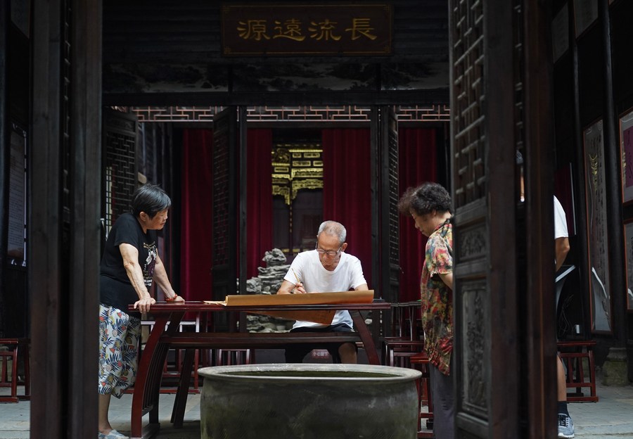 A guest practices calligraphy in an old house in Sanping Village of Zhongyuan Township in Jing'an County of east China's Jiangxi Province, July 27, 2022. (Xinhua/Wan Xiang)■
