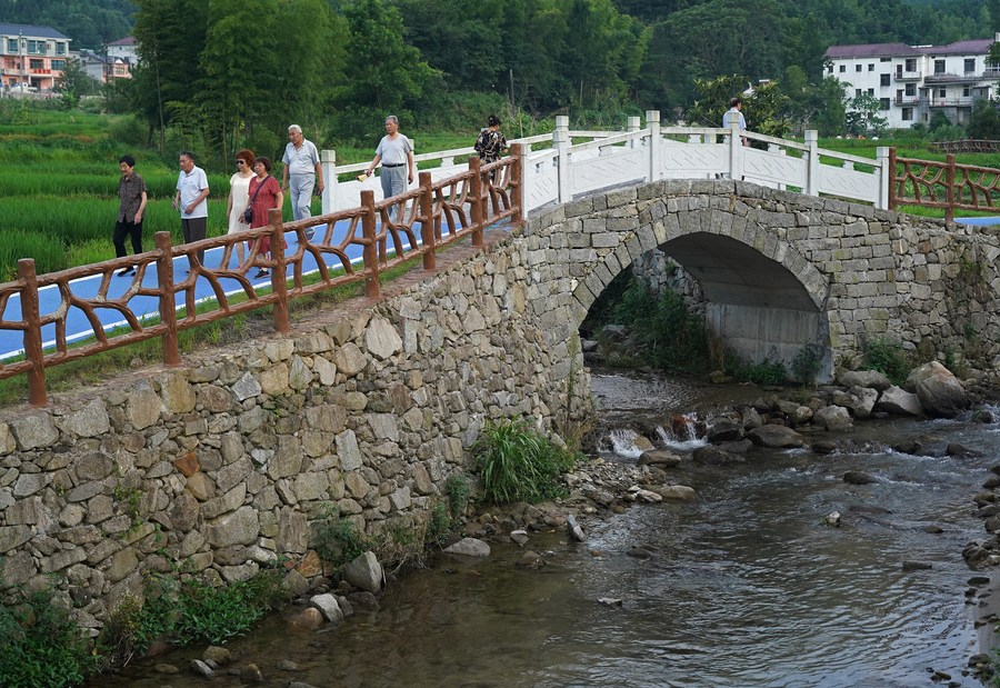 Tourists walk along a stream in Sanping Village of Zhongyuan Township in Jing'an County, east China's Jiangxi Province, July 27, 2022. (Xinhua/Wan Xiang)