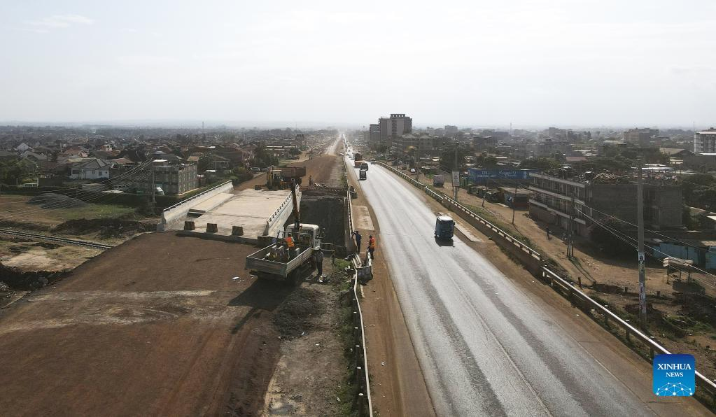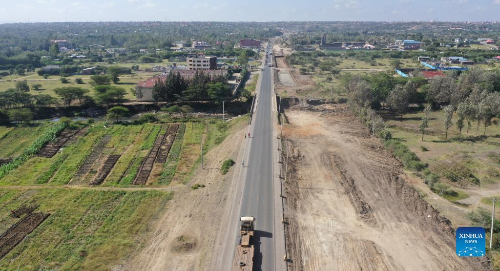 Aerial photo taken on Jan. 30, 2022 shows a section of the Nairobi Eastern Bypass under construction in Nairobi, Kenya. Kenya's President Uhuru Kenyatta on Sunday hailed Chinese-built roads in his country for boosting development and cutting travel times. Kenyatta made the comments when speaking at the commissioning ceremony for the Nairobi Expressway and the revamped Nairobi Eastern Bypass. The Nairobi Eastern Bypass project was undertaken by China Communications Construction Company in January and has widened the bypass from the original two-lane single carriageway into a four-lane and six-lane dual carriageway. (Photo by Wang Heng/Xinhua)