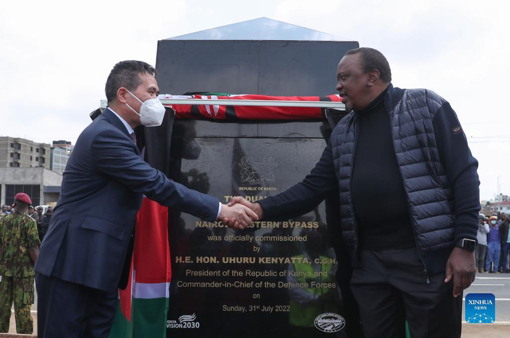 Kenya's President Uhuru Kenyatta (R) shakes hands with Chinese Ambassador to Kenya Zhou Pingjian when attending the commissioning ceremony for the revamped Nairobi Eastern Bypass in Nairobi, Kenya, July 31, 2022. Kenya's President Uhuru Kenyatta on Sunday hailed Chinese-built roads in his country for boosting development and cutting travel times. Kenyatta made the comments when speaking at the commissioning ceremony for the Nairobi Expressway and the revamped Nairobi Eastern Bypass. The Nairobi Eastern Bypass project was undertaken by China Communications Construction Company in January and has widened the bypass from the original two-lane single carriageway into a four-lane and six-lane dual carriageway. (Xinhua/Long Lei)