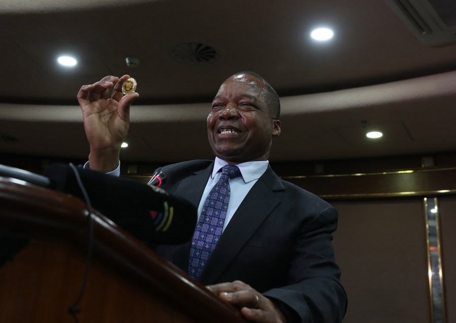 The Reserve Bank of Zimbabwe Governor John Mangudya displays the newly introduced gold coin during a press conference in Harare, Zimbabwe, July 25, 2022. (Photo by Shaun Jusa/Xinhua)