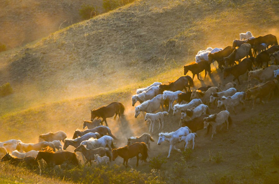 Horses run on a grassland in West Ujimqin Banner of Xilingol League, north China's Inner Mongolia Autonomous Region, May 17, 2022. (Xinhua/Peng Yuan)