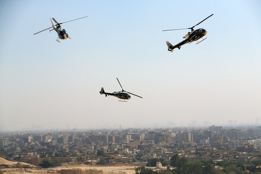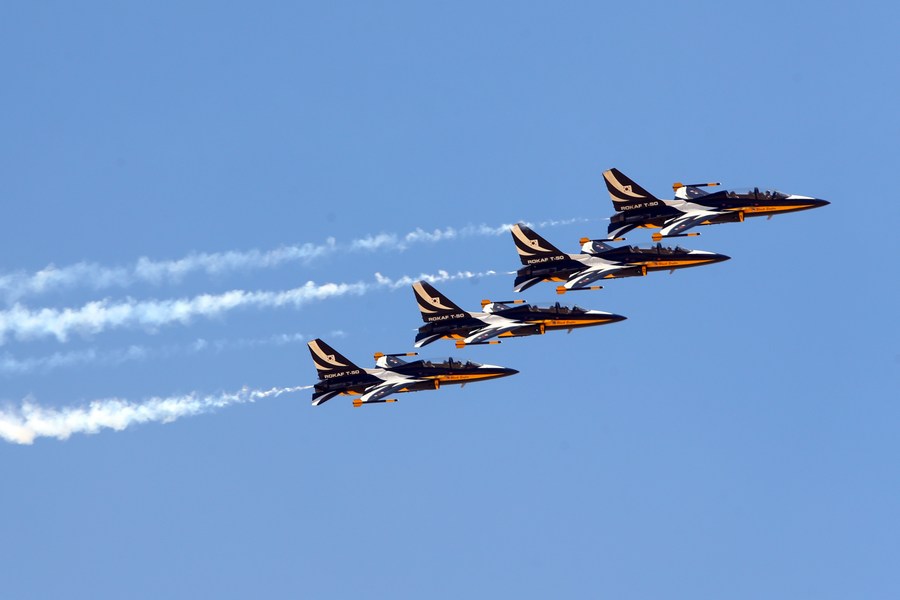 Egyptian air forces' "Silver stars" aerobatics team and ROK's "Black Eagles" aerobatic team jointly launched the show at the Pyramids scenic spot in Giza, Egypt, according to Egyptian media reports.