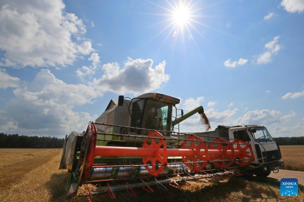 Photo taken on Aug. 4, 2022 shows grains just been harvested in Minsk, Belarus. (Photo by Henadz Zhinkov/Xinhua)