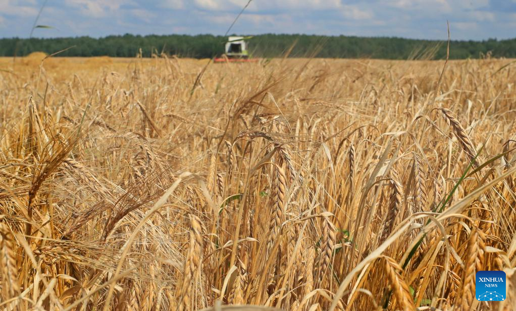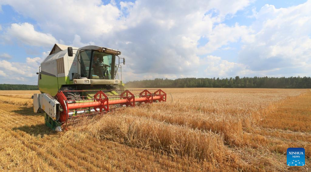 A reaper harvests grains in Minsk, Belarus, Aug. 4, 2022. (Photo by Henadz Zhinkov/Xinhua)