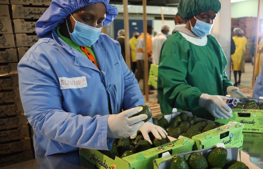 Staff members put fresh avocados into boxes at Sunripe factory in Limuru Town, Kiambu County, Kenya, on Aug. 2, 2022. (Xinhua/Dong Jianghui)