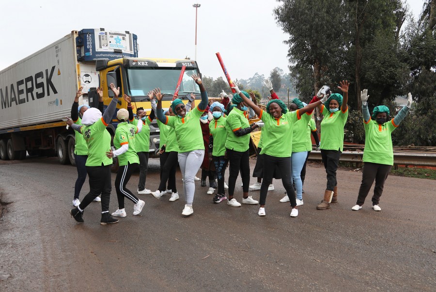 Staff members celebrate the departure of the first batch of fresh avocados grown in Kenya and destined for the Chinese market in Limuru Town, Kiambu County, Kenya, on August 2, 2022. (Xinhua/Dong Jianghui)