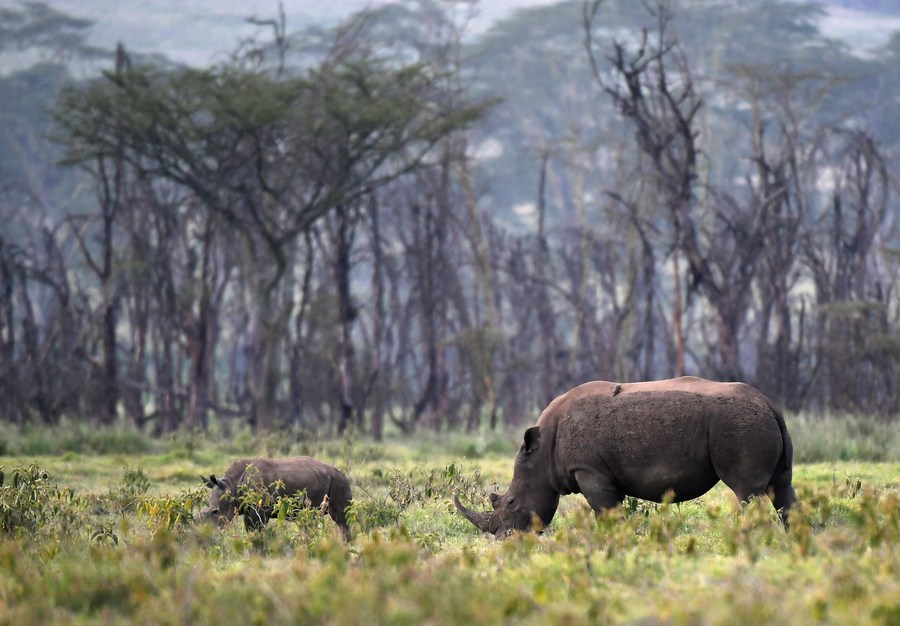 Photo taken on June 20, 2017 shows black rhinos in the Lake Nakuru National Park, Kenya. (Xinhua/Chen Cheng)