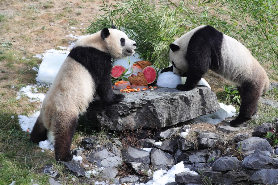 Giant panda twins "Bao Di" (L) and "Bao Mei" have birthday meal at the Pairi Daiza zoo in Brugelette, Belgium, Aug. 6, 2022. (Xinhua/Zheng Huansong)