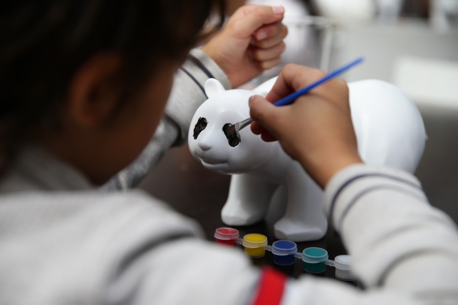 A child colors a giant panda doll during a celebration activity of the third birthday of the panda twins Bao Di and Bao Mei at the Pairi Daiza zoo in Brugelette, Belgium, Aug. 6, 2022. (Xinhua/Zheng Huansong)■