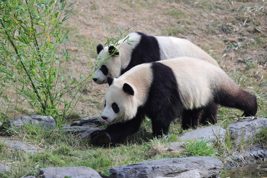 Giant panda twins "Bao Di" (bottom) and "Bao Mei" walk towards their birthday meal at the Pairi Daiza zoo in Brugelette, Belgium, Aug. 6, 2022. (Xinhua/Zheng Huansong)
