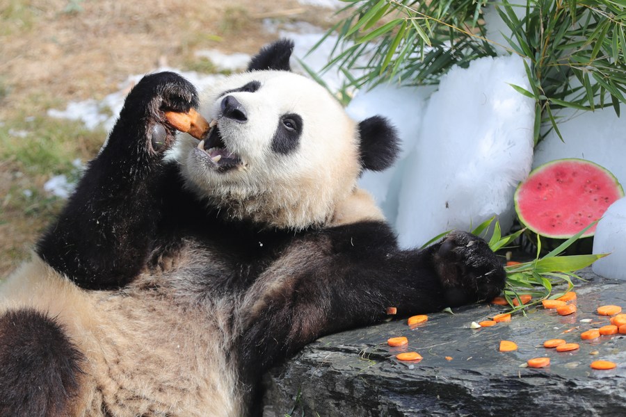 Giant panda "Bao Di" has birthday meal at the Pairi Daiza zoo in Brugelette, Belgium, Aug. 6, 2022. (Xinhua/Zheng Huansong)