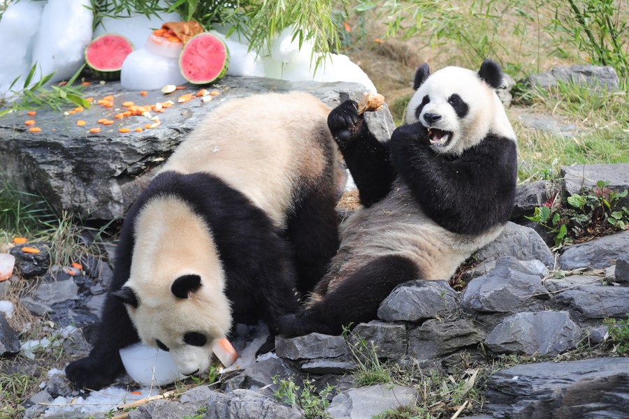 Giant panda twins "Bao Di" (L) and "Bao Mei" have birthday meal at the Pairi Daiza zoo in Brugelette, Belgium, Aug. 6, 2022. (Xinhua/Zheng Huansong)
