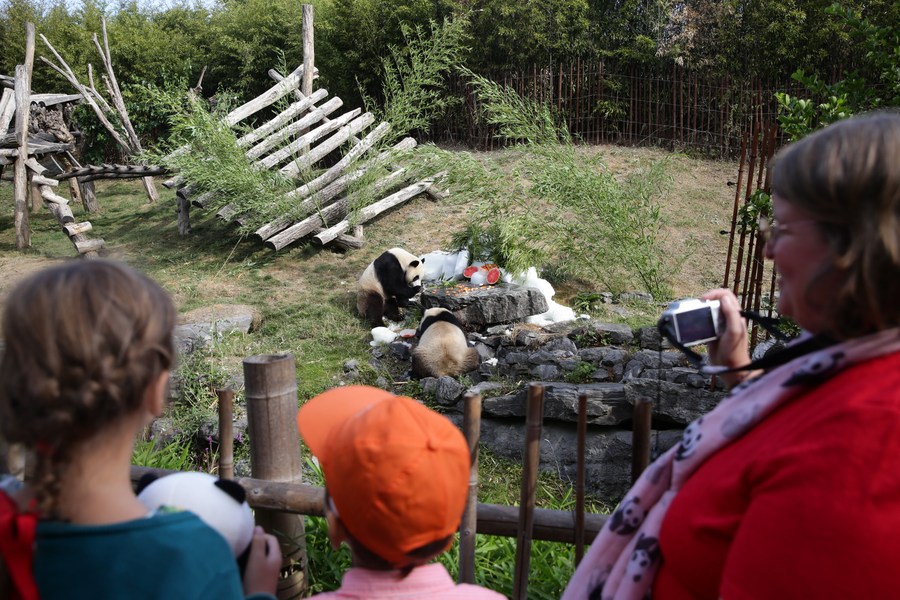 Visitors watch giant panda twins "Bao Di" (L) and "Bao Mei" having birthday meal at the Pairi Daiza zoo in Brugelette, Belgium, Aug. 6, 2022. (Xinhua/Zheng Huansong)■