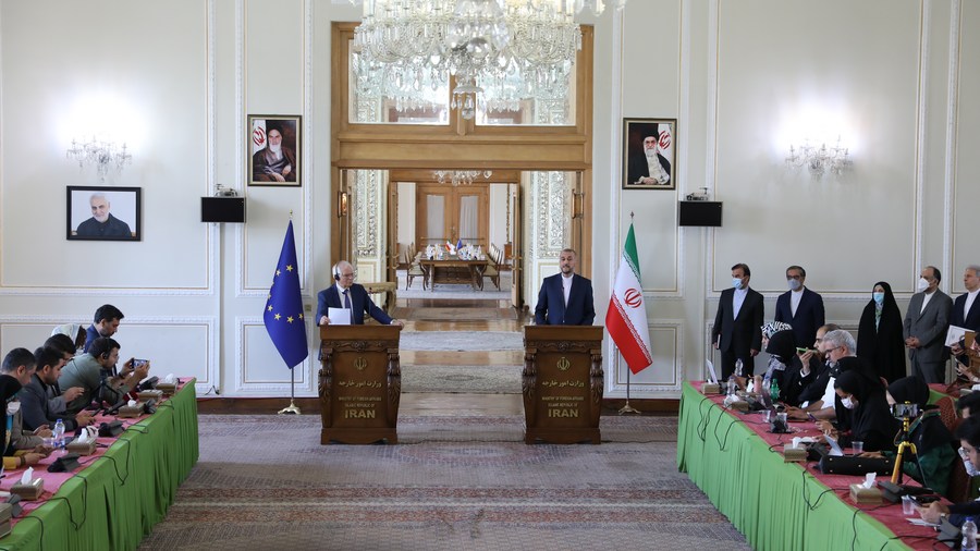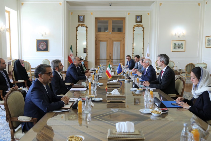Iranian Foreign Minister Hossein Amir-Abdollahian meets with European Union foreign policy chief Josep Borrell in Tehran, Iran, on June 25, 2022. (Iranian Foreign Ministry/Handout via Xinhua)